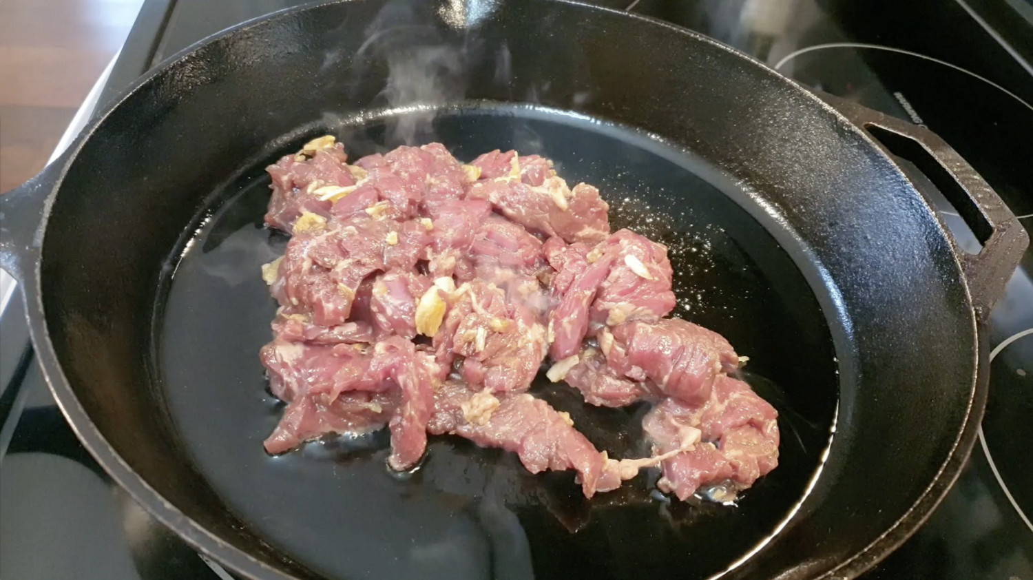 예열해둔 팬에 기름을 두르고 양념해둔 치마살을 넣고 볶아주세요.