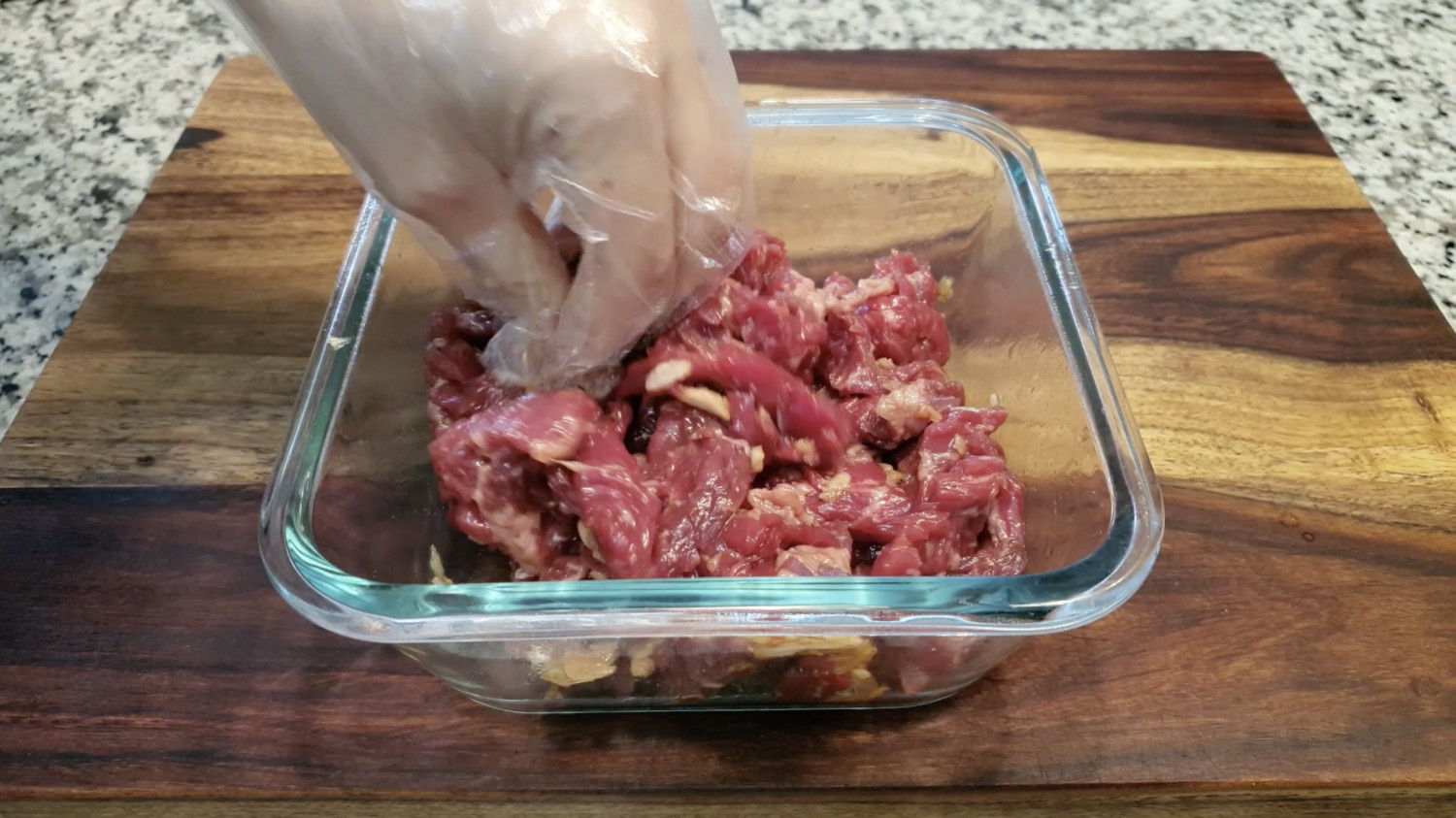 이렇게 작은 조각들만 모은 치마살 400g에 간장 25ml과 미림 2숟가락, 올리브 오일 1숟가락, 마늘 3알을 다져서 넣어주세요.
