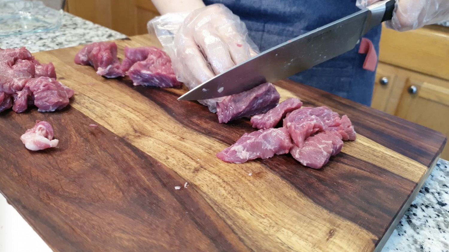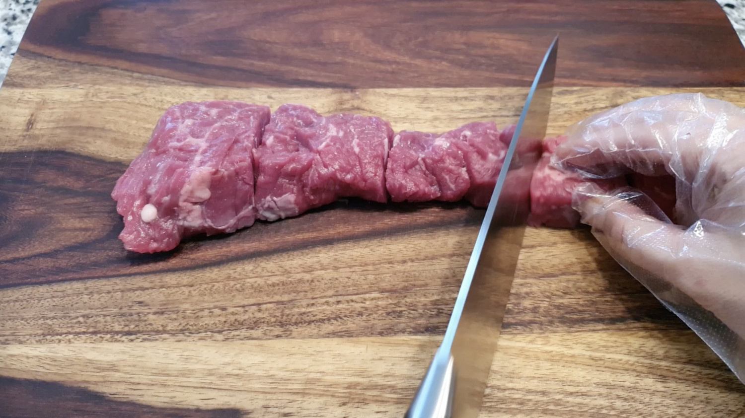 우선은 고기 결에 반대방향 4등분으로 잘라 줄께요.