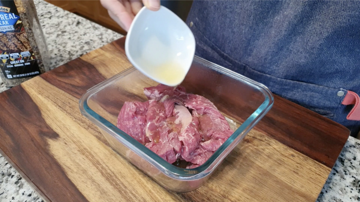 이렇게 얇게 썰어둔 치마살 300g에 올리브오일 2숟가락을 넣어주세요.