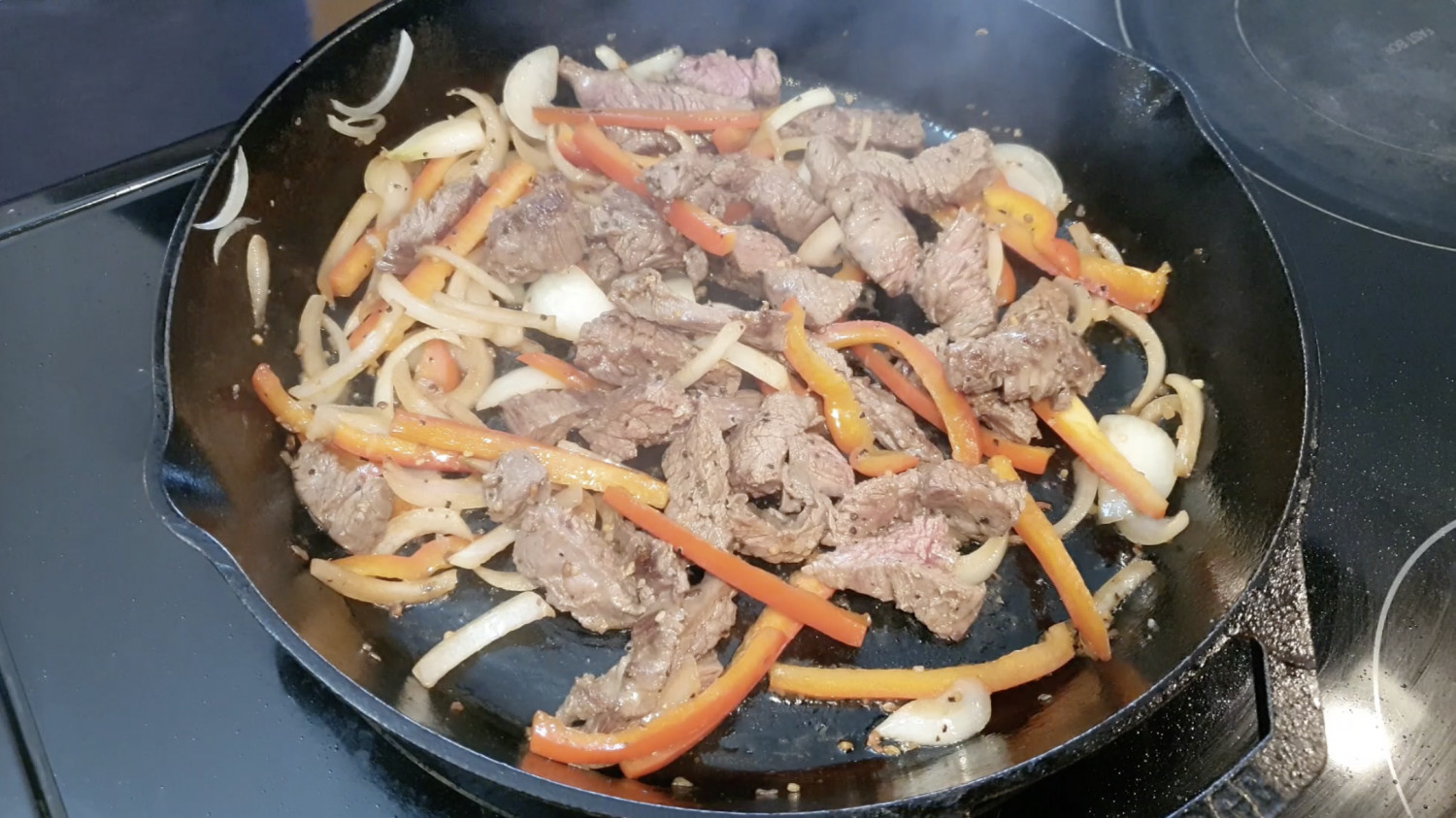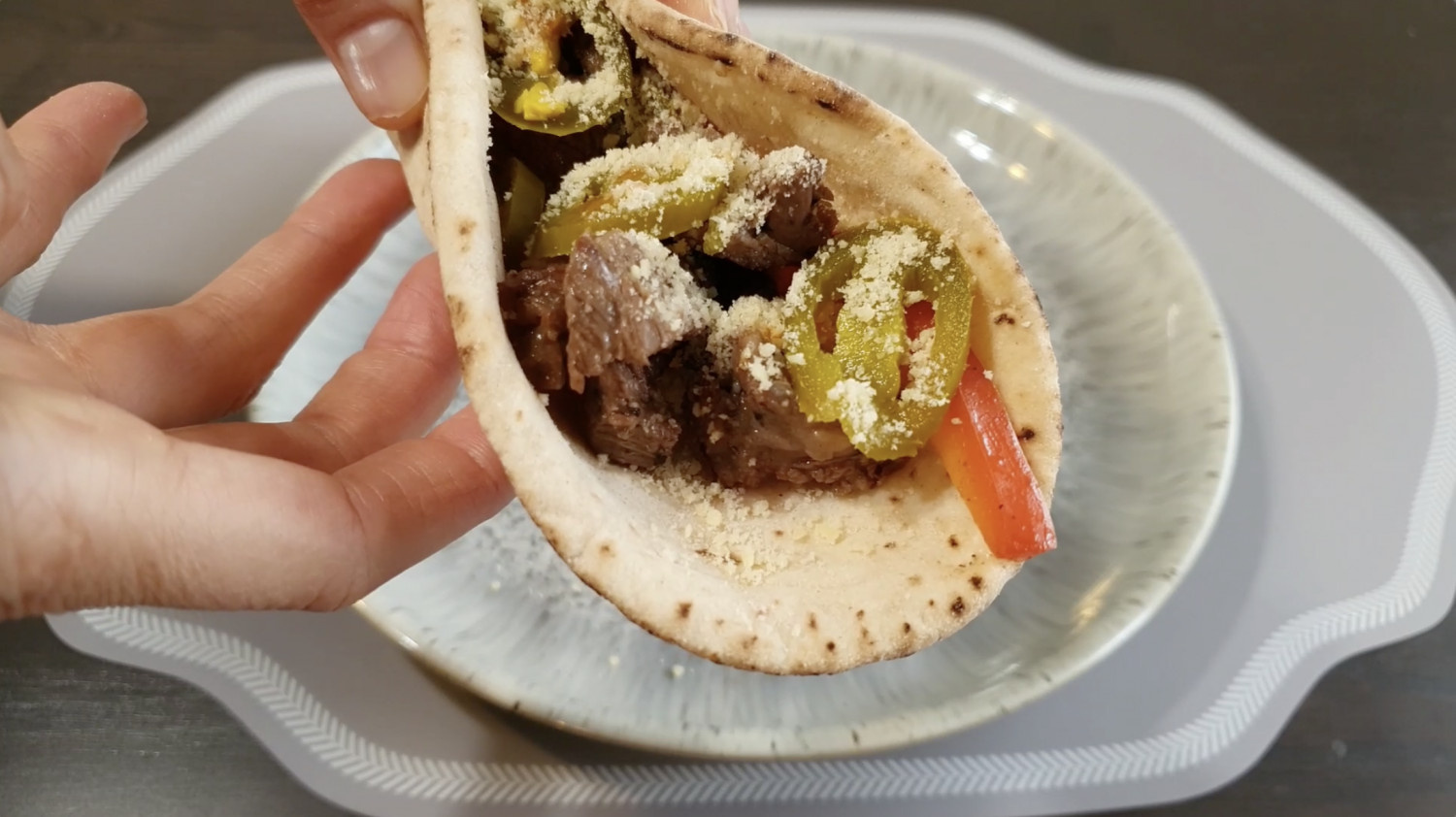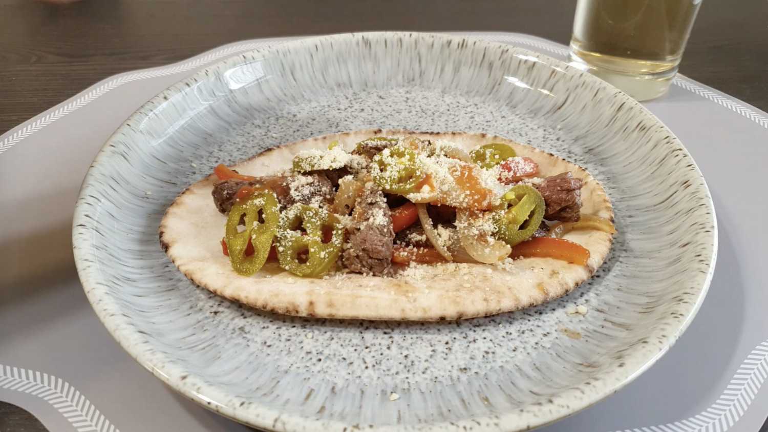 구워 둔 피타 브레드 위에 볶아둔 소고기와 할라피뇨 피클, 파마산 치즈 그리고 타바스코 소스를 취향껏 뿌려서 드세요~