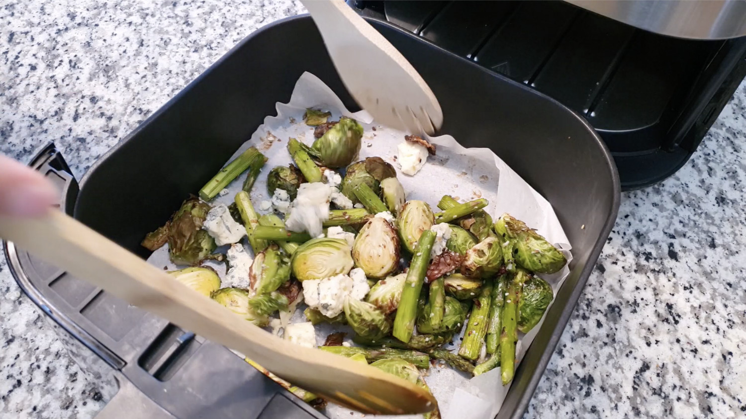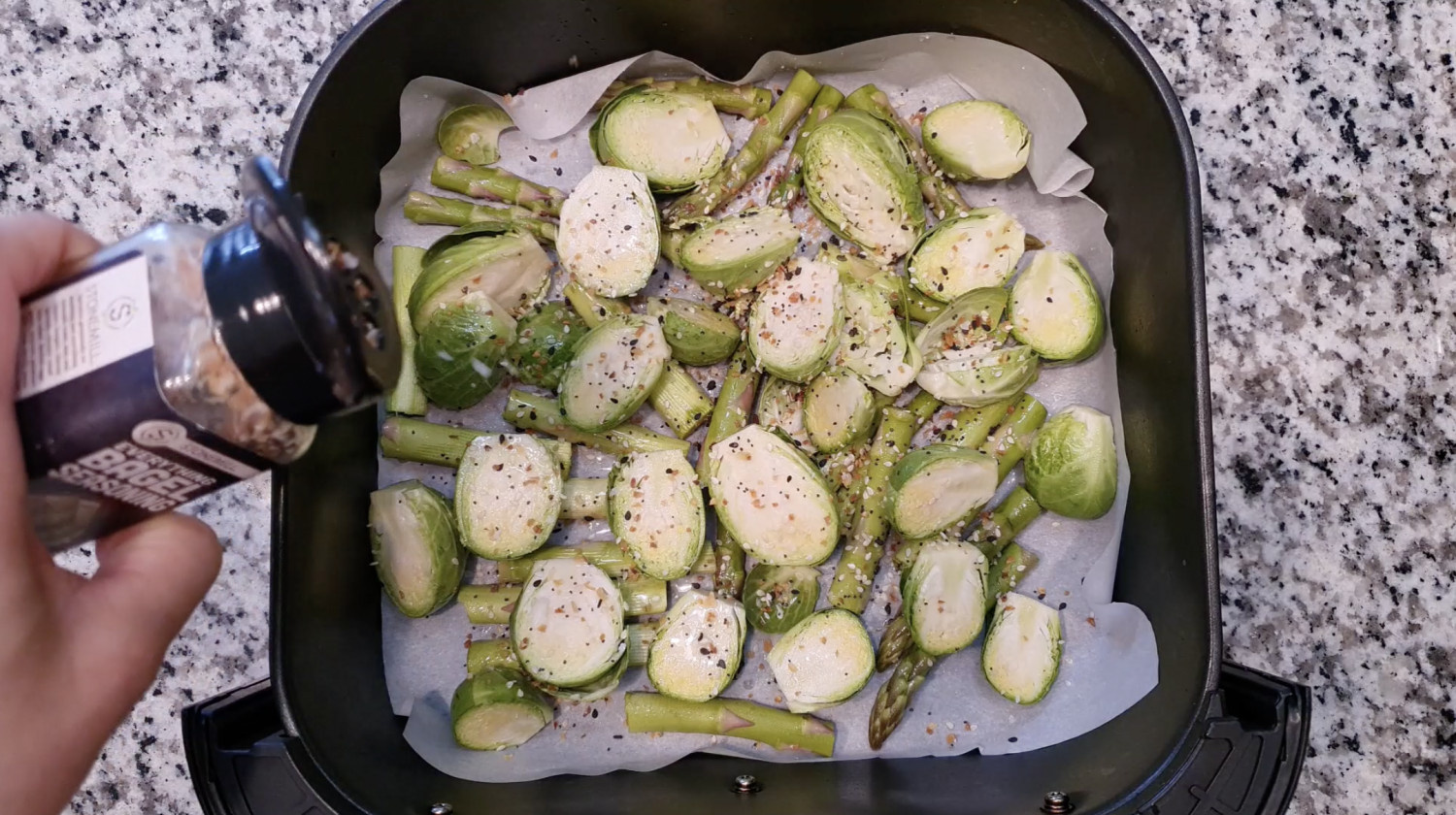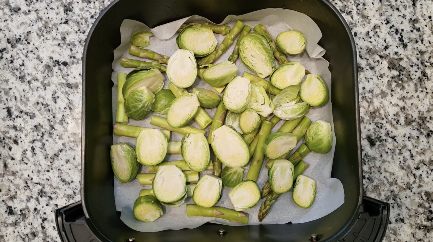 에어프라이어에 아스파라거스, 방울 양배추를 적당한 크기로 잘라 넣어주세요.