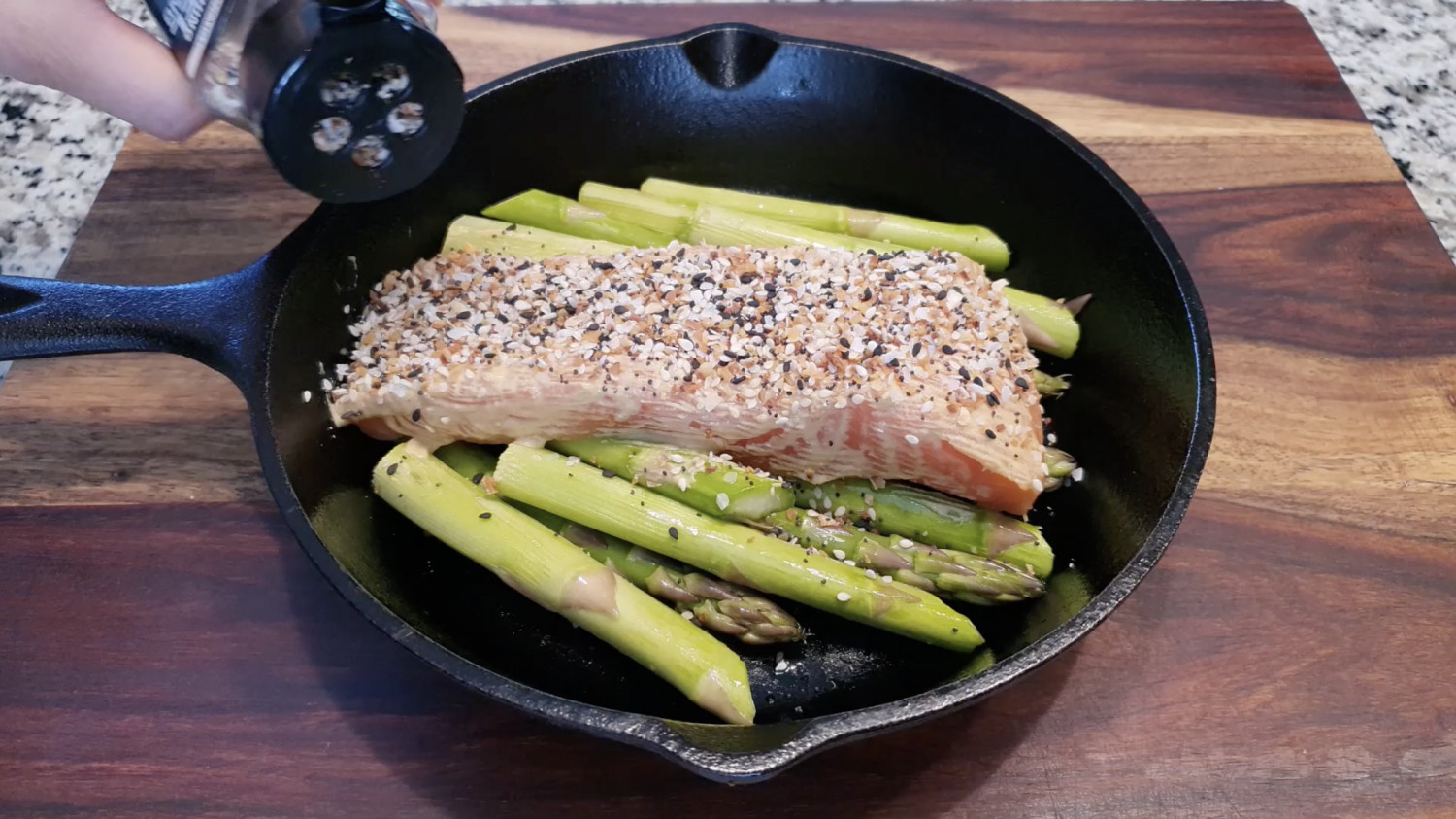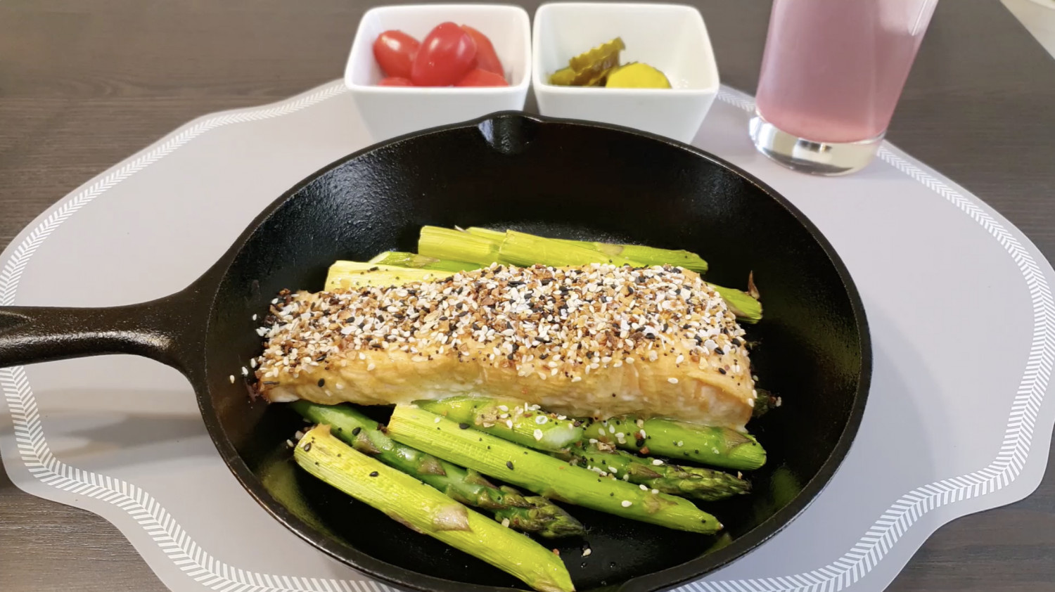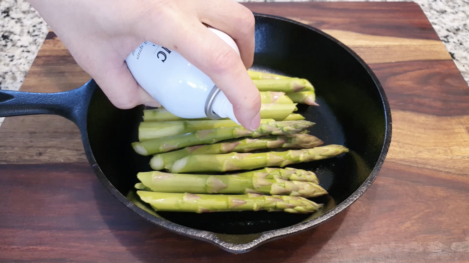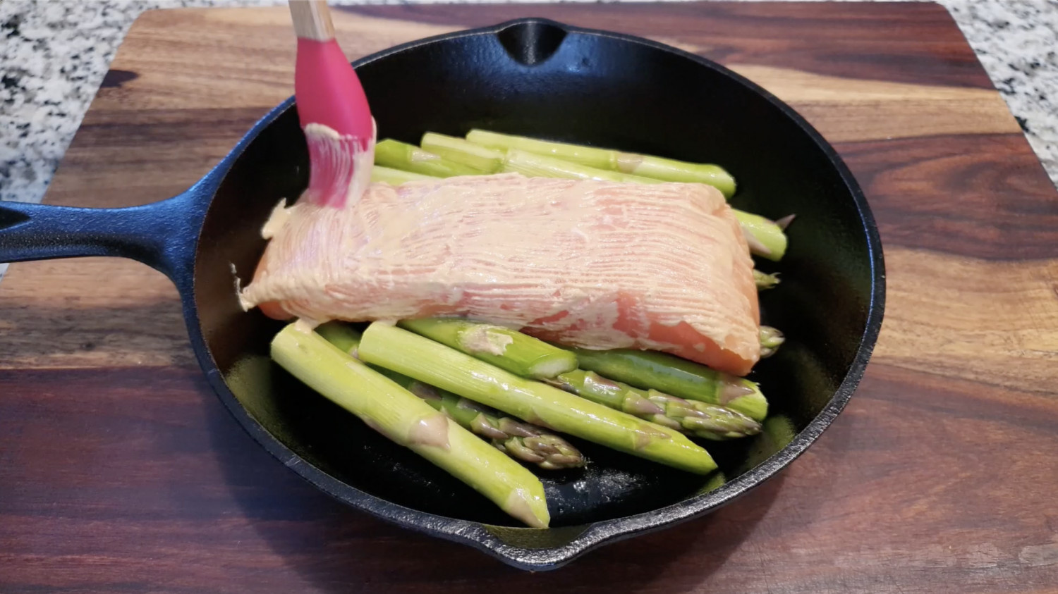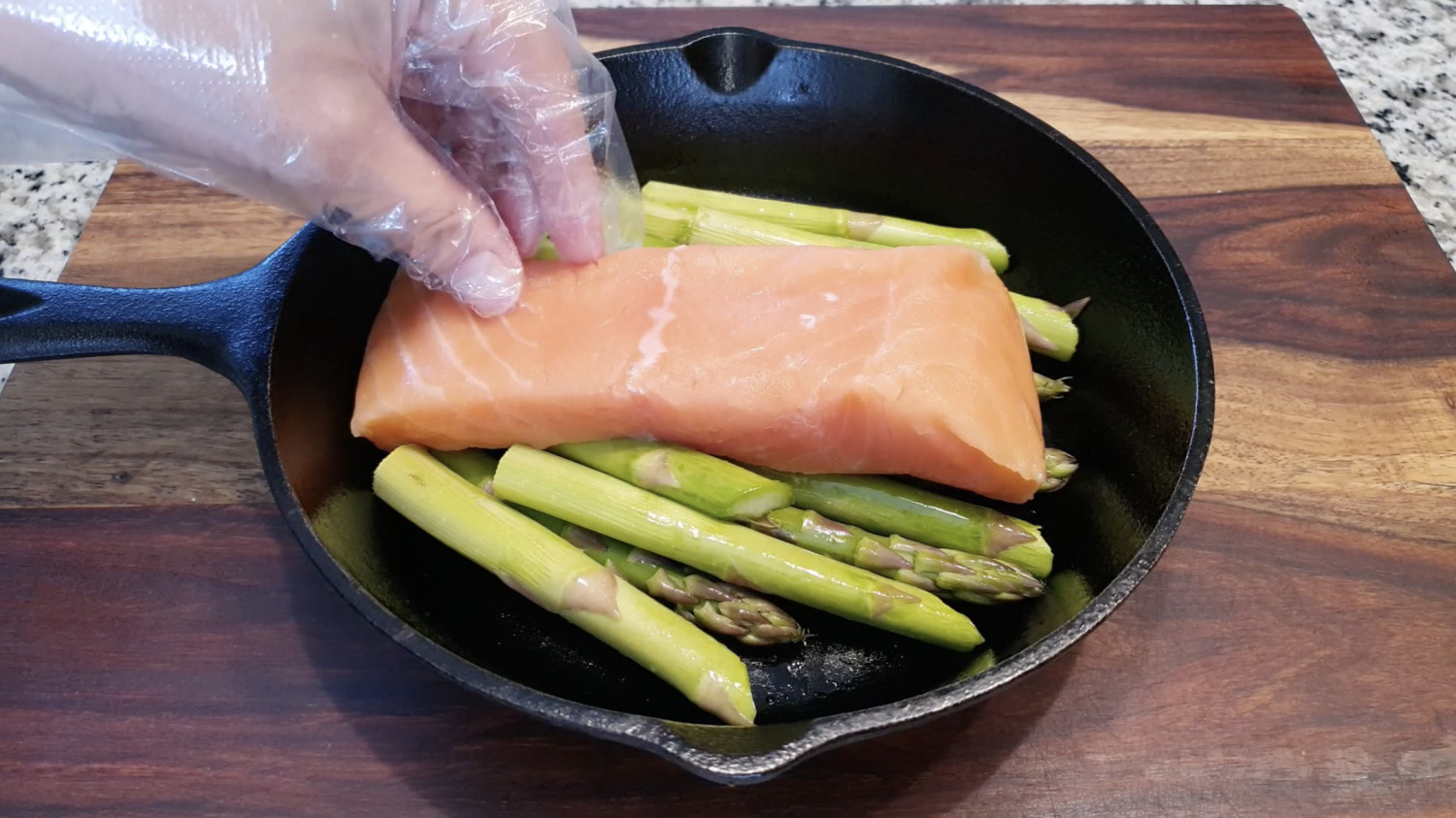 [연어스테이크] 무쇠팬 위에 적당한 크기로 썬 아스파라거스를 올리고 아보카도 오일을 골고루 뿌려주세요.