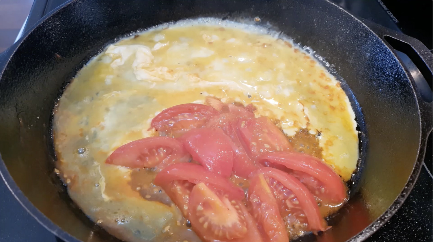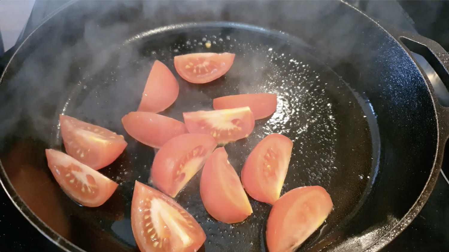적당한 크기로 썰어 둔 토마토 2개를 예열해 둔 팬에 볶다가 설탕 1/2숟가락도 넣고 볶아주세요.