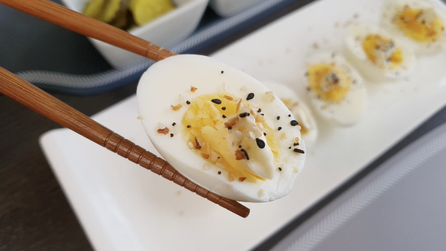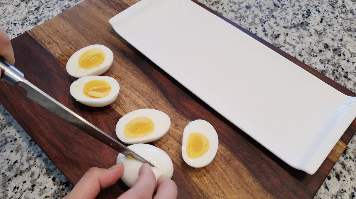 [데빌드에그] 삶은 계란을 반으로 자르고 마요네즈를 적당히 올려주세요.