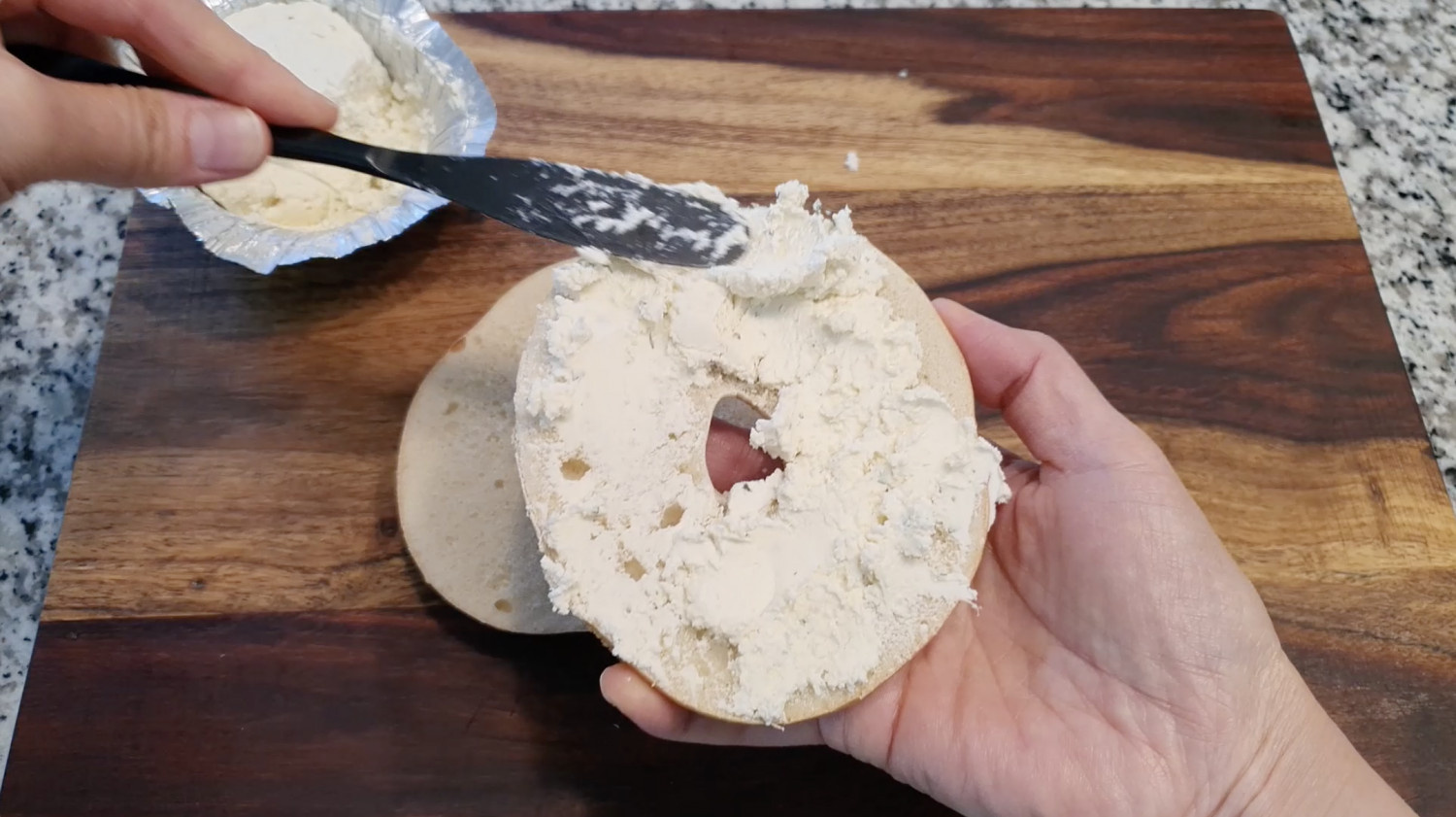 [아보카도 샌드위치] 베이글을 반으로 잘라 크림치즈를 듬뿍 발라주세요.