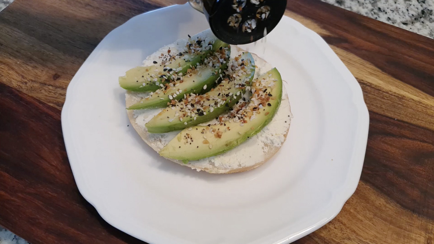 그위에 얇게 썬 아보카도를 올리고 에브리띵 베이글 시즈닝을 톡톡 뿌려주시면 아보카도 샌드위치 완성!