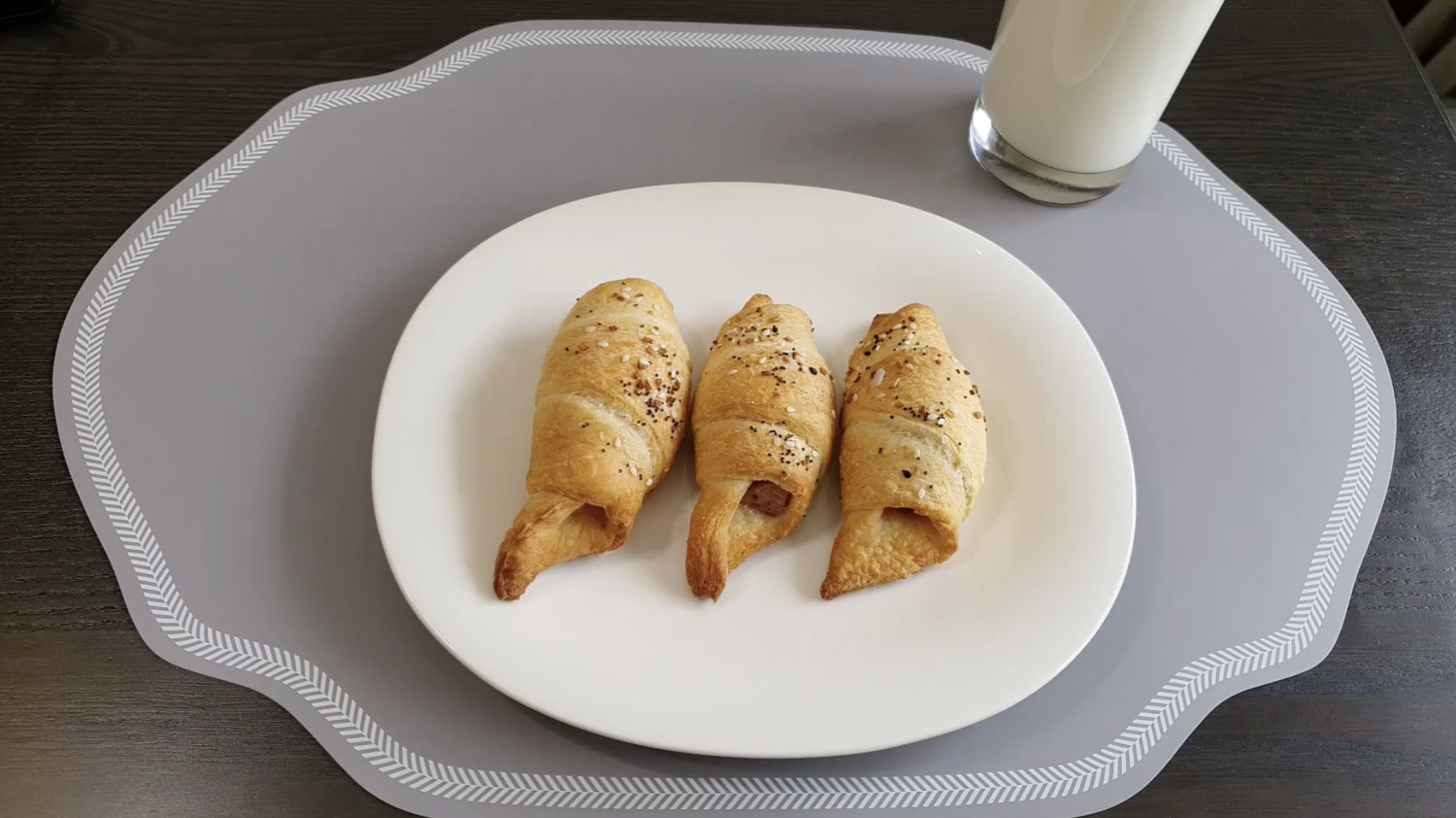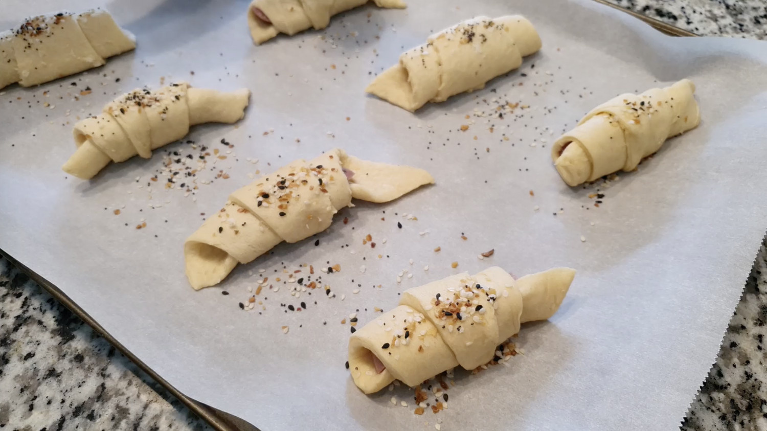 크로와상 롤 생지로 소시지를 잘 말아 주시고 오븐 판 위에 올리고